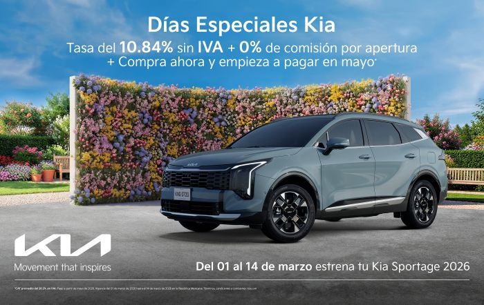 Aprovecha los Días Especiales Kia para hacerte del Kia Sportage 2026, el SUV icónico que combina diseño impactante, tecnología avanzada y versatilidad. Disfruta de una tasa preferente del 10.84% sin IVA y 0% comisión por apertura. Además, compra ahora y empieza a pagar hasta mayo. Perfecto para la ciudad y más allá, con seguridad y confort para toda la familia.