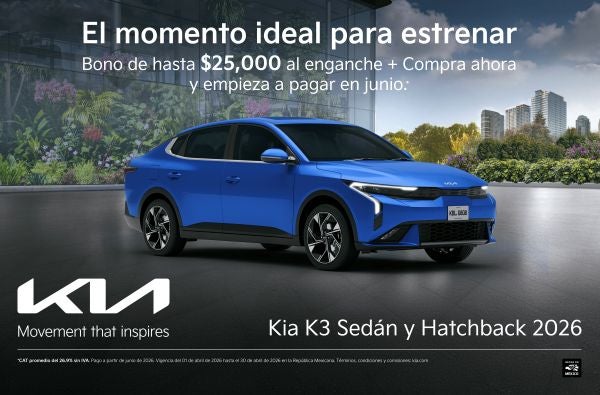Aprovecha el momento ideal para estrenar el Kia K3 2026, disponible en versiones Sedán y Hatchback, combinando diseño dinámico, tecnología avanzada y seguridad líder en su clase. Recibe un bono de hasta $25,000 aplicado directamente a tu enganche y la facilidad de comprar ahora con pagos hasta junio. Estilo, confort y el respaldo que inspira movimiento.